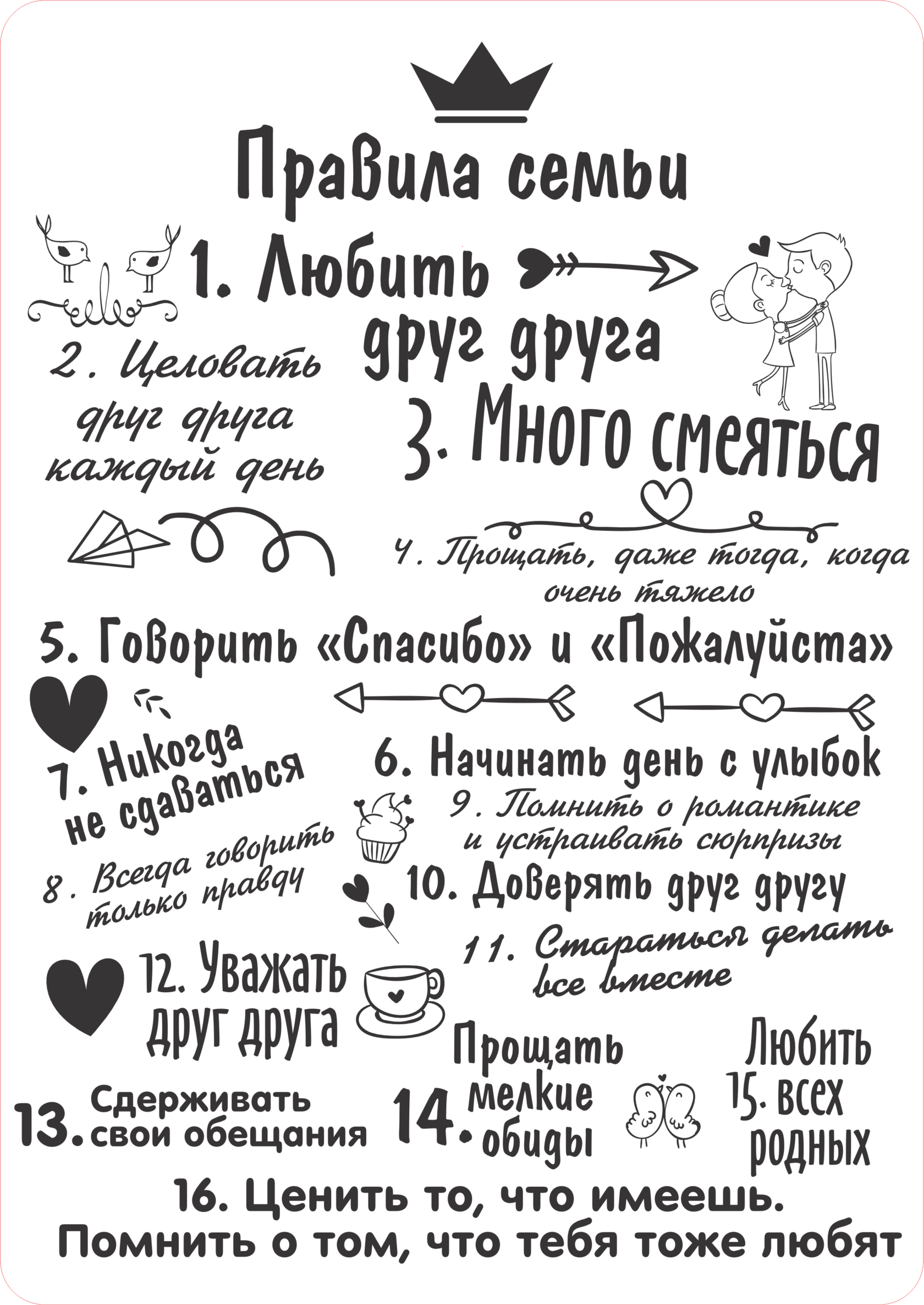 Размещение правил дома на стене в виде сувенира помогает всем членам семьи постоянно напоминать себе о важности соблюдения этих правил. Это может способствовать более гармоничным и уважительным отношениям в семье. Вы можете выбрать дизайн, шрифт и цвет текста, а также добавить свои собственные правила или цитаты, которые имеют особое значение для вашей семьи.