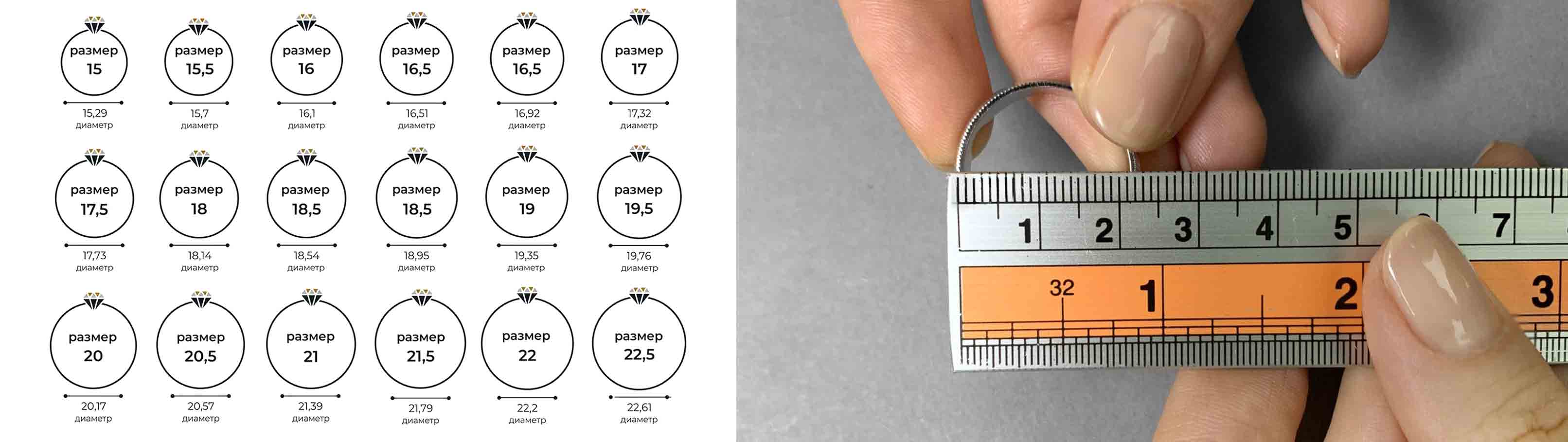 - В России размер кольца обычно равен внутреннему диаметру в миллиметрах.